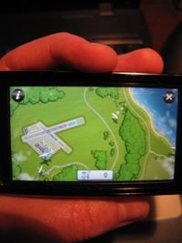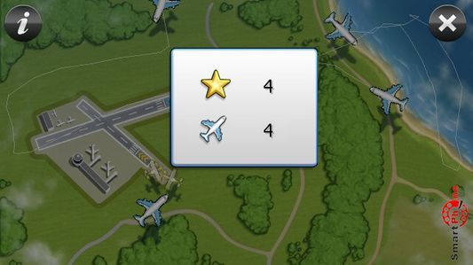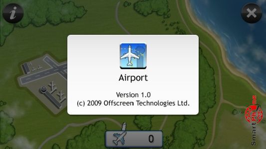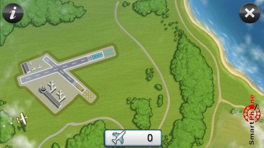 Как уже говорилось ранее, интерфейс главного меню игры не имеет структуры, в следствии чего после нажатия ярлыка игры сразу запускается игровой процесс. Как видно из представленного выше скриншота за фон игрового табло взято изображение земли с воздуха. Внизу экранного табло размещен счетчик, отображающий общее количество посаженных нами самолетов. Вверху экранного табло размещены две функциональные клавиши, которые позволяют нам просматривать информацию о данной версии игры и её разработчиках, а также выходить из игры в главное меню нашего смартфона. Следует заметить, что во время просмотра информации о игре, игровой процесс продолжается, так что будьте бдительны:
