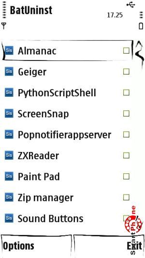 главного меню программы присутствуют два пункта: слева пункт Options (содержит в себе все необходимые функции для адекватной работы с утилитой), справа находится пункт Exit (позволяет выходить из программы в главное меню нашего смартфона).