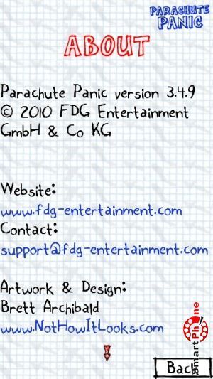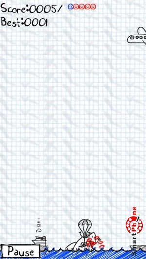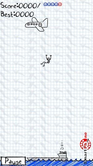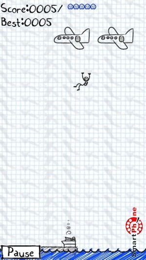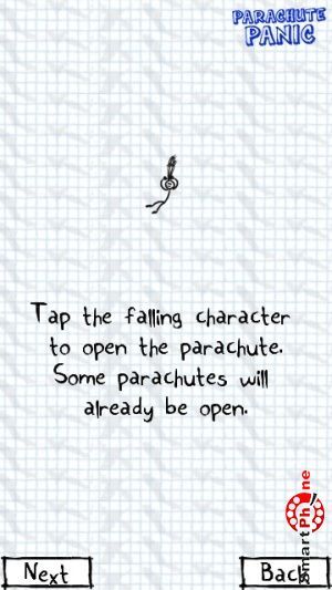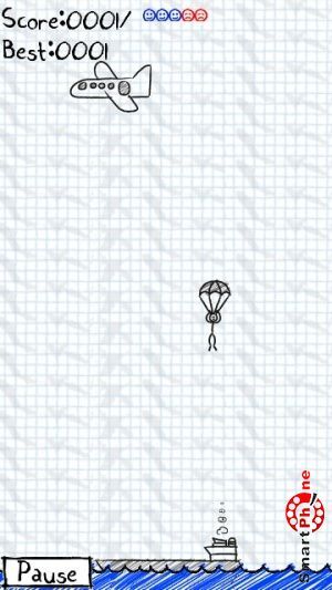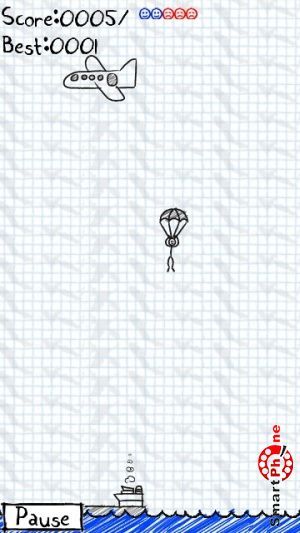 счетчик набранных очков, счетчик посаженных парашютистов, и счетчик разбившихся парашютистов. Для того чтобы у парашютиста раскрылся парашют, необходимо клацнуть на нем стилусом смартфона. Регулирование направления посадки парашютиста выполняется также с помощью стилуса смартфона. В правом нижнем углу размещена функциональная кнопка, позволяющая устанавливать паузу в игре.