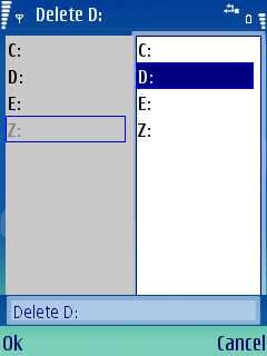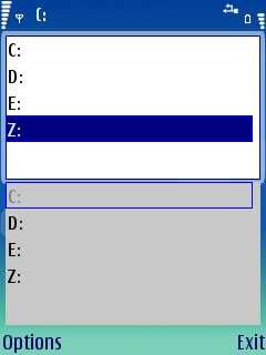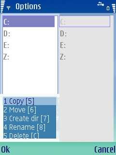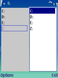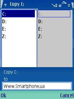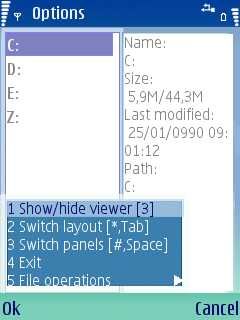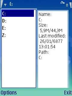 Интерфейс главного меню программы довольно прост, и представляет собой двухсторонний файловый менеджер. Слева отображается каталог файлов и дисков памяти, перемещение по которому осуществляется с помощью джойстика нашего смартфона. Справа отображается информация о диске памяти, либо файле, в зависимости от того, на чем стоит курсор программы.