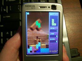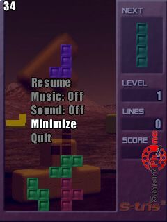 Базовое управление игровым процессом очень простое - перемещение фигур влево-вправо мы можем осуществлять с помощью джойстика нашего смартфона. Также с помощью джойстика мы можем придавать ускорение падающей фигуре, что очень удобно, так как, определившись с местом падения не нужно тратить время на ожидание. Вращение фигур мы можем выполнять с помощью левой-правой софт клавиш нашего смартфона. Чтобы поставить игру на паузу нам необходимо нажать красную клавишу нашего смартфона. Находясь в режиме паузы, мы можем вкл/выкл. музыкальные и звуковые эффекты игры, свернуть работу игры и выйти из игры: