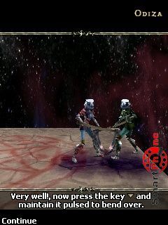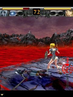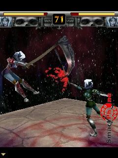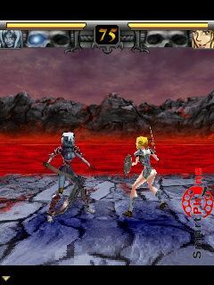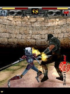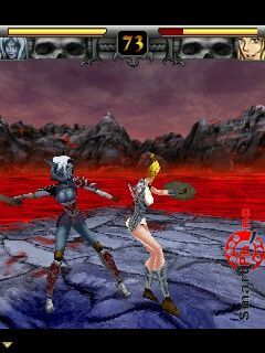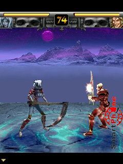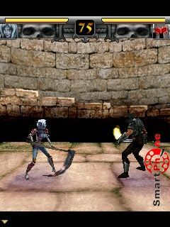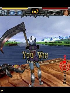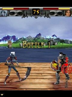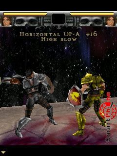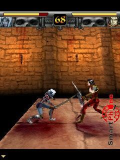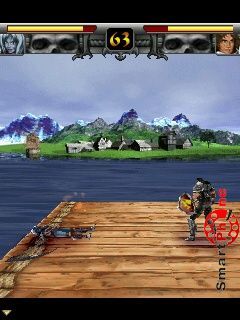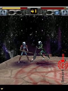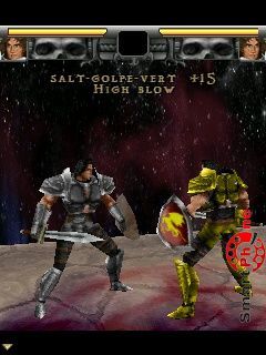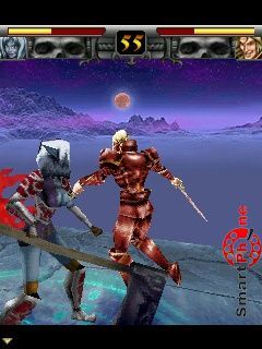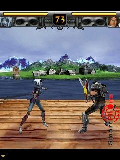 Как видно из представленного выше скриншота, бои проходят на своеобразных платформах (рингах). Положительной чертой является то, что игрок не может спихнуть другого игрока с ринга, как это бывает во многих драках. 3-D графика позволяет игроку выбрать свою динамику движений и свободно перемещаться по всему рингу, атакуя противника. Вверху игрового меню размещены строки, отображающие уровни жизни бойцов. Между этими строками размещается счетчик обратного времени, по истечению которого бой выигрывает тот, у которого осталось больше жизни. Существует множество секретных комбинаций клавиш, с помощью которых игрок может применять различные приемчики к противнику. Опыт в "откалывании" приемов приходит в процессе игры, а запомнить комбинации клавиш довольно трудно. Управление игроком мы осуществляем с помощью джойстика нашего смартфона, удары оружием производим с помощью клавиши "6" клавиатуры нашего смартфона. Следует отметить, что назначение функциональных клавиш можно сменить в настройках игры. С прохождением каждого боя, появляется новый противник в новой локации (ринг с другим фоновым окружением). Очень понравился тот факт, что противник учится на наших ошибках и использует их против нас в бою. Также значительным плюсом можно считать тот факт, что в случае проигрыша боя весь прогресс прохождения игры не сбрасывается, нам дается возможность взять реванш.