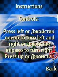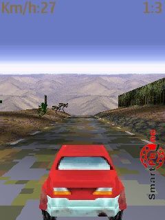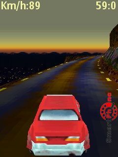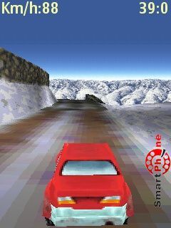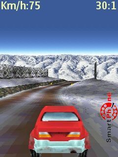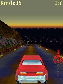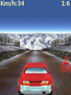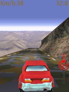 Как видно из представленного выше скриншота, игровое меню представлено игроку довольно скудной кубатурной графикой, которая присуща многим 3-D играм. Не порадовала также слишком медленная прорисовка текстур - по мере продвижения автомобиля медленно прорисовываются пейзажи, что в значительной степени осложняет процесс навигации в игровом пространстве трассы. Если говорить об управлении, то оно в игре на достаточно высоком уровне, автомобиль превосходно слушается руля. Все управление производится с помощью джойстика нашего смартфона. Также хочу отметить, что вверху игрового меню отображены текущая скорость автомобиля и счетчик времени. Огорчил тот факт, что в случае "вылета" автомобиля с трассы скорость снижается, но урона авто не происходит, что в некоторой степени не правдоподобно.
