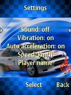 настройками. С помощью основных настроек мы можем: вкл./выкл. звуковые эффекты, вкл./выкл. виброэффекты, вкл./выкл. автоматическую акселерацию раллийного автомобиля, задать единицы измерения скорости нашего авто, задать имя игрока: