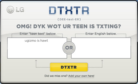 LG запустил электронный переводчик SMS-сленгаСервис DTXTR был запущен компанией LG как переводчик специфического SMS-сленга, используемого детьми и подростками. Теперь эти особые сокращения и выражения можно легко понять, что сможет быть большим подспорьем для родителей. Сервисы такого типа ранее еще не появлялись.