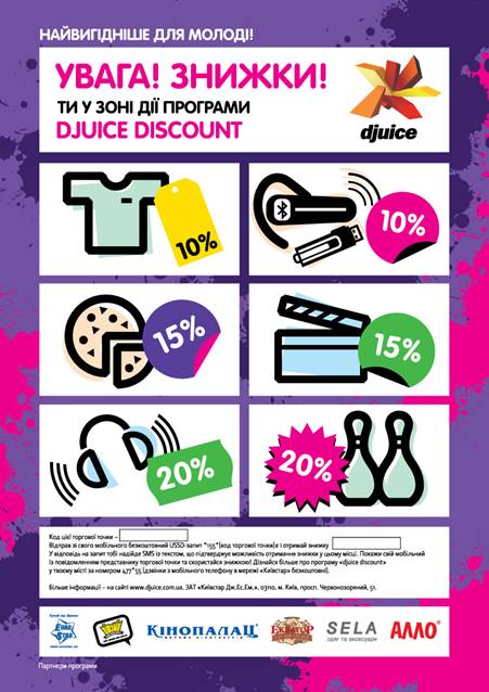 DJUICE DISCOUNT – лучшие скидки!Все, что нужно молодежи для активной жизни, становится доступным благодаря DJUICE DISCOUNT. DJUICE DISCOUNT – это мгновенные скидки на модную одежду, вкусную еду, актуальные развлечения, музыку и различные гаджеты. Новая программа лояльности для всех абонентов DJUICE будет действовать в течение года – с 10 июня 2009 г. по 31 мая 2010 г.