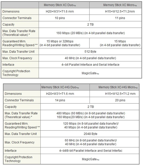 памяти стандарта Sony Memory Stick XC имеют те же физические размеры,