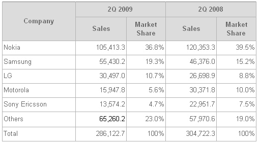 рынок мобильных телефонов во втором квартале 2009 года и поделилась