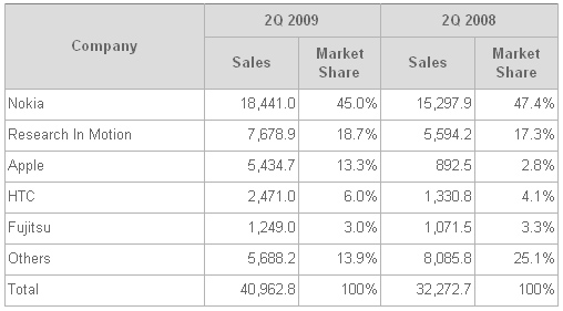 Продажи смартфонов во втором квартале 2009 года
