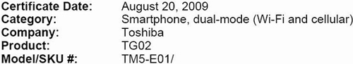 Этот аппарат помимо названия Toshiba TG02, также обозначается индексом TM5-E01. Как вы помните, в марте этого года устройство с таким индексом прошло сертификацию в Федеральной Комиссии Связи США (FCC), где коммуникатор Toshiba TG02 описывался как раскладушка, но на фотографиях был представлен моноблок. К сожалению, сайт организации Wi-Fi Alliance не вносит ясность по этому вопросу.