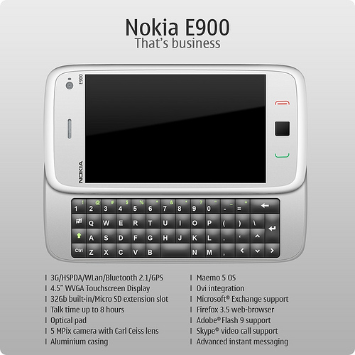 Nokia E900 – концепт бизнес-смартфона на Maemo 5Судя по всему, под впечатлениями от анонса первого смартфона Nokia на Maemo (N900), один из пользователей решил продемонстрировать свое видение того, как должен выглядеть аппарат на Maemo для бизнес-пользователей. Смартфон выполнен в форм-факторе бокового слайдера, сильно напоминающий