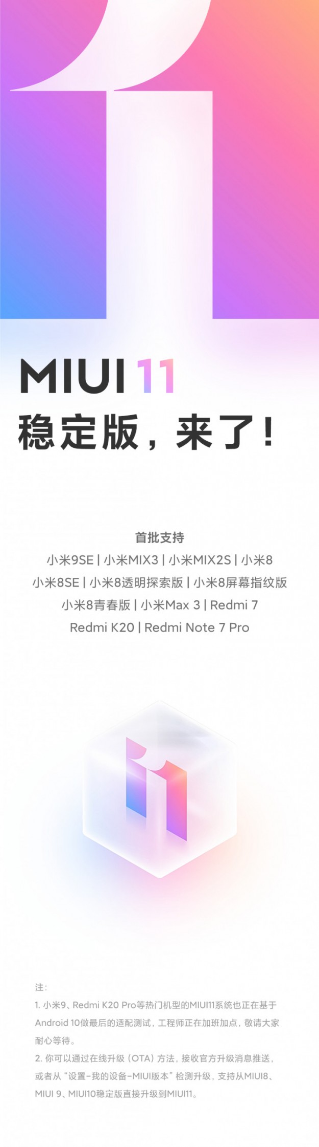 Xiaomi начала масштабное обновление своих смартфонов до MIUI 11. Соответствующее сообщение компания опубликовала в социальных сетях. Стабильную версию нового ПО получат владельцы 12 моделей Xiaomi и Redmi из Китая (China ROM). В списке преимущественно флагманские модели этого года, но нашлось место и Redmi 7, Redmi Note 7 Pro, Mi Max 3. Полный список моделей вы найдете ниже. Напомним, MIUI 11 привнесет некоторые правки дизайна пользовательского интерфейса, в том числе новые анимации, обновленный AOD на модели с AMOLED, режим экстремального энергосбережения, режим для детей, инструменты для контроля времени, проведенного в том или ином приложении и прочие плюшки. Программа обновления растянется на несколько месяцев и затронет большинство действующих смартфонов Xiaomi и Redmi (а еще Pocophone и Black Shark).