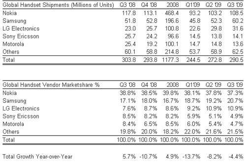 в третьем квартале 2009 года было продано 290,5 миллионов мобильных