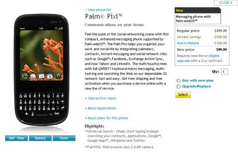С двухлетним контрактом Palm Pixi продается за $99,99. Каких-либо видимых преимуществ модели перед Pre, цена на которую достаточно сильно упала после запуска, нет. Технические характеристики Palm Pixi: