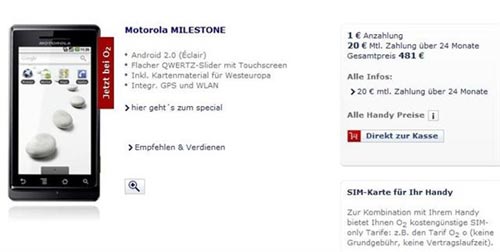 В Германии смартфон Motorola Milestone оценили в 1 евроСотовый оператор O2 Germany предлагает своим абонентам смартфон Motorola Milestone по цене 1 евро. Смартфон Motorola Milestone, известный в США как Droid, поступил в