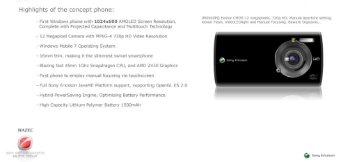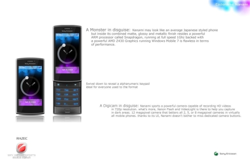 Sony Ericsson Nanami: продвинутый смартфон с огромным дисплеемДизайнер под ником Razec, участник сетевого сообщества Esato, представил свою новую работу — концепт смартфона Sony Ericsson Nanami. Устройство выполнено в форм-факторе ротатора, оно имеет на борту 3,1-дюймовый дисплей, а также камеру, которая позволяет делать фотоснимки разрешением 12 мегапикселей, а также снимать видео высокой четкости (720p) в формате MPEG-4. ![]() Разрешение вышеупомянутого 3,1-дюймового дисплея составляет 1024 x 600 точек, он изготавливается по OLED-технологии и оснащается сенсорной панелью. В качестве программной платформы выступает ОС Windows Mobile 7, а за аппаратную часть отвечают процессор Snapdragon с тактовой частотой 1 ГГц, а также графический чипсет AMD Z430, поддерживающий OpenGL ES 2.0. И все это умещается в корпусе толщиной 16 мм.