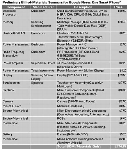 Стоимость компонентов Google Nexus One равна $174,15К аналитикам исследовательской фирмы iSuppli попала калькуляция