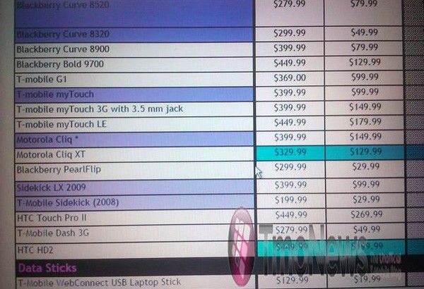 Moto Cliq XT, взятых с базы данных T-Mobile, но