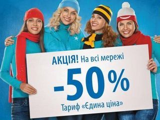 Акция «-50%» — это выгодная экономия для клиентов тарифного плана «Единая цена». «Киевстар» предоставляет своим клиентам доступные услуги при лучшем качестве связи.