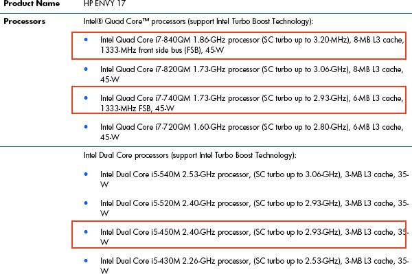 Модель i7-840QM может увеличить частоту своего процессора с 1.86GHz до 3.20GHz (или до 3.20MHz, если это не опечатка). В свою очередь i7-740QM приобретет 2.93 GHz вместо 1.73GHz и i5-450M 2.93 GHz вместо 2.4GHz.