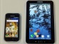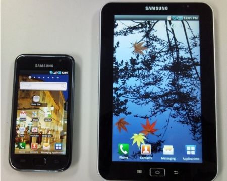 В левом углу размещен 4-ех дюймовый смартфон Samsung Galaxy S. В правом – 7-ми дюймовый Samsung Galaxy Tab. На фото отсутствуют 8-ми и 10-и дюймовые планшетники, которые заметно больше своих братьев и поэтому уменьшают оба аппарата на фото. Galaxy Tab это общее название для трех приборов c тачскрином от Samsung, которые появятся в свободной продаже по очереди - сначало 7-ми дюймовая модель в августе, затем 8-ми дюймовая в ноябре и, наконец, в декабре 10-и дюймовая.