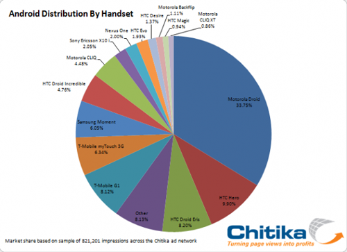 Motorola Droid занял 33,76% рынка Android-смартфоновЗанимающаяся онлайн-рекламой компания Chitika выяснила, что Motorola Droid занял 33,76% рынка Android-смартфонов. Вторым по популярности Android-смартфоном стал HTC Hero. Он получил 9,9%