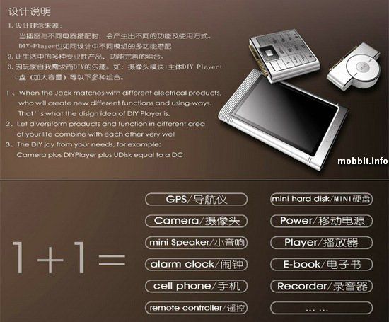 Модульное концептуальное устройство все-в-одномИзобретение дизайнера Shao Wen – DIY Player – объединяет в себе сразу несколько устройств: мобильный телефон, портативный медиаплеер, игровую консоль и т.д. Основа DIY Player – экран, к которому в зависимости от нужд пользователя присоединяется тот или иной модуль: клавиатура – чтобы превратить девайс в телефон, блок с медиаклавишами – чтобы получить плеер, импровизированный джойстик - чтобы получить игровую консоль, и т.п. Очень простой и изящный концепт, дающий, к тому же, возможность бесконечного обновления и усовершенствования устройства.