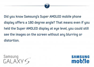 У дисплея Samsung Galaxy S угол обзора 180 градусовМы уже знаем, что Super AMOLED-дисплей Samsung Galaxy S намного лучше стандартных AMOLED-экранов. Лишним подтверждением этих слов стала информация о том, что Super