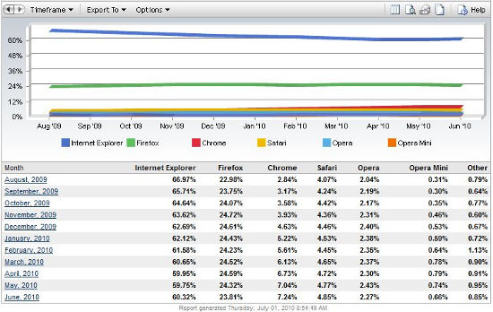 Интересное событие произошло на рынке веб-браузеров. Согласно данным исследовательской фирмы Net Applications за июнь 2010 года, браузер Internet Explorer несколько неожиданно увеличил свою рыночную долю и вновь преодолел 60-процентную планку популярности, ниже которой он опустился в марте текущего года. ![]() Таким образом, разработка корпорации Microsoft впервые за многие