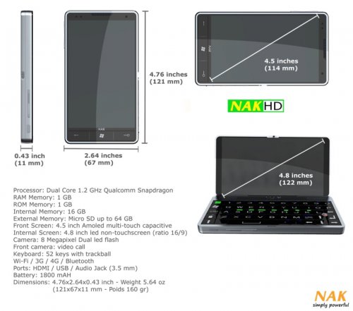 Дизайнер Antoine Brieux представил концепт устройства, которое является чем-то средним между мобильным интернет-устройством, смартфоном и планшетом. Девайс получил название NAK HD и выглядит несколько резковато, чему