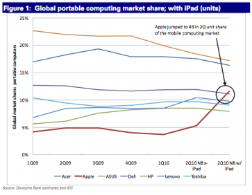 Продажи планшета iPad продолжают оставаться на высоком уровне уже несколько месяцев, причем, не только на американском рынке, но и в тех странах, где этот продукт дебютировал официально. При этом именно феноменальный успех iPad, по мнению экспертов, позволил компании Apple занять третье место на глобальном рынке мобильных компьютеров, обозначив показатель роста в 200 процентов в годовом исчислении и перескочив сразу через четыре позиции. ![]() Во всяком случае, об этом говорится в отчете аналитика Deutsche Bank