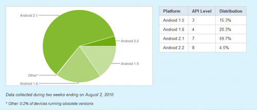 Увеличивается доля Android 2.1 EclairДоля Android 2.1 Eclair среди всех операционных систем семейства Android постепенно увеличивается, и на сегодняшний день она достигла 59,7%. А операционные системы Android 1.5 и 1.6 теперь занимают всего 15,3% и