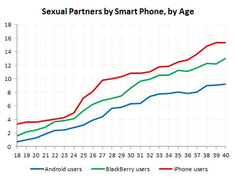 Владельцы iPhone чаще занимаются сексомЛюбопытные графики опубликовал сайт знакомств OK Cupid. Собрав данные более чем с 11,4 млн посетителей, ведущие ресурса заявили, что у владельцев Apple iPhone больше всего сексуальных партнеров. ![]() На первом графике видно, что у 30-летних мужчин, пользующихся iPhone, в среднем было 10 партнеров, а у 30-летних женщин с iPhone – 12,3. Для BlackBerry эти показатели составляют 8,1 и 8,8 партнеров, для Google Android – 6 и 6,1. ![]() На втором графике кривая iPhone постоянно выше Android и BlackBerry. Если судить по нему, то начиная с 18 лет у тех, кто пользуется телефоном Apple, партнеров всегда больше, чем у других. Интерпретировать данные OK Cupid можно по-разному. С одной стороны, владельцы iPhone могут пользоваться большим успехом у противоположного пола. С другой, владельцы iPhone тяготеют к неразборчивым связям. Никита Сергеев. Mobiltelefon.RuПо материалам blog.okcupid.com Джерело: mobiltelefon.ru Обговорення новиниКоментариев пока никто не оставил. Станьте первым! Попередні новини