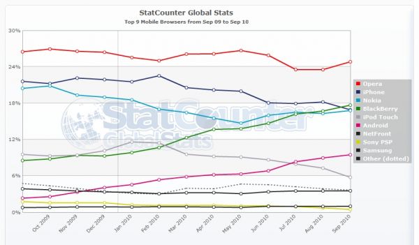 Safari для iPhone — 16.9%. Браузер от Nokia занимает лишь