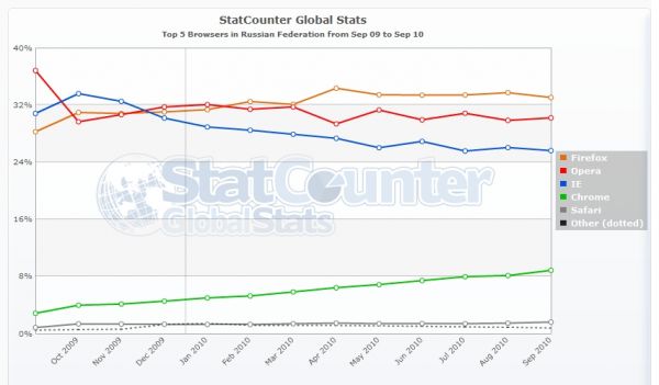 Firefox c 33.03% и Opera с 30.18%. На четвертом месте Chrome – 8.84%.