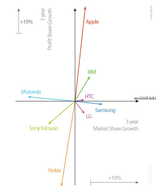 словам компании Asymco, являющейся автором данного графика, Apple постепенно «добивает» Nokia, то RIM (производитель Blackberry) убивает Sony Ericsson, то же самое происходит у Samsung с Motorola. Также неблагоприятно влияет HTC на LG, но в этом случае процесс идет намного медленнее.