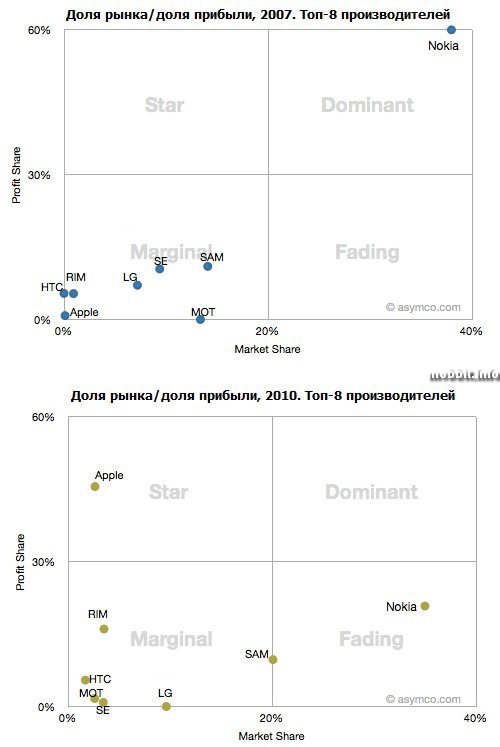 доминировали на рынке телефонов в 2007 и как обстоят дела в 2010 году.