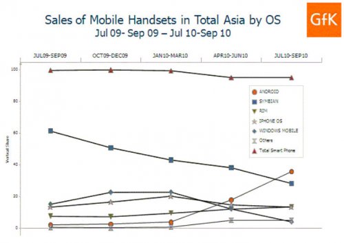 В третьем квартале этого года каждое пятое мобильное устройство, продаваемое в странах Азии, было смартфоном, сообщает GfK Asia. Это почти в 4 раза больше по сравнению с аналогичным периодом прошлого года. ![]()