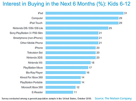 31% детей хочет получить iPadКомпания Nielsen выяснила, какой подарок хотят получить дети в возрасте 6-12 лет. Рейтинг самых желанных подарков для детей возглавил iPad. Больше всего