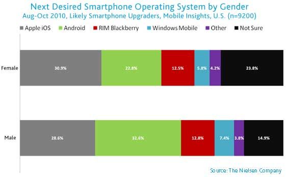Выяснилось, что больше всего покупателям охота Apple iPhone. На втором месте уверенно закрепились решения на Google Android. При этом iPhone больше интересует женщин (30,9% против 28,6%), а Android – мужчин (32,6% и 22,8%). Процентные соотношения можно увидеть на слайдах.