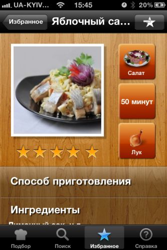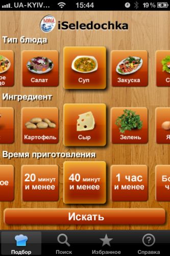 Обзор приложения iseledochkaНесмотря на обилие кулинарной литературы, рецепты из отрывных календарей и телешоу «поглядите, как прытко мы готовим», многие из нас так и не научились этой премудрости. ![]() Все это вместе с новым приложением iseledochka для iPhone даёт возможность не только насладиться вкуснейшими блюдами из любимой селёдочки, но и бросить вызов своим кулинарным способностям! ![]() Итак, на столе в ожидании лежит селедочка, а в ваших руках – iPhone с упомянутой выше iseledochka. Сперва программа спросит у вас, какое блюдо вы желаете откушать, а также какими ингредиентами и запасом времени вы располагаете. Как только вы определитесь с «исходными данными», получите оптимальный для вас рецепт. ![]()
