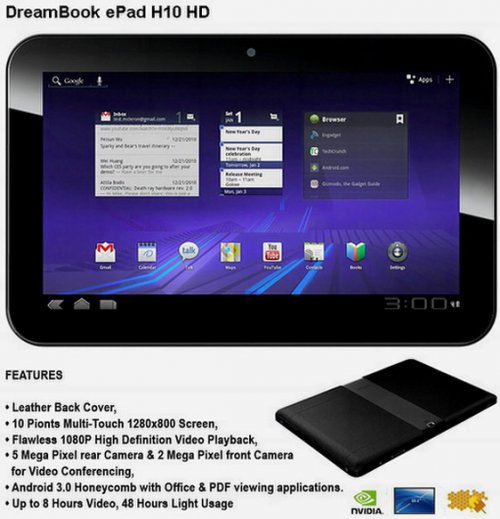 DreamBook ePad H10 – первый планшет Pioneer Computers, работающий на платформе Android 3.0 Honeycomb. Устройство оборудовано 10.1-дюймовым экраном с разрешением 1280 x 800 пикселей и двухъядерным процессором Nvidia Tegra 2 и является прямым конкурентом Motorola Xoom и Samsung Galaxy Tab 10.1. В апреле этого года планшет выйдет в продажу в Австралии по цене около $705. Технические характеристики Pioneer DreamBook ePad H10 HD: