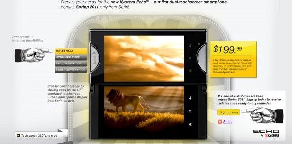 Заказы на Kyocera Echo начнут приниматься с 26 марта, а на прилавках трубка появится 17 апреля.