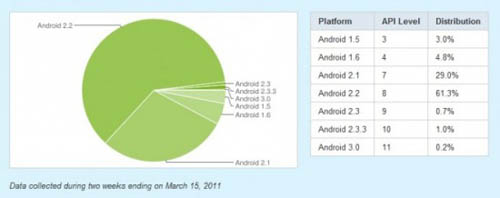 Google подвела итоги развития Android за месяцНа днях Google обновила статистику по своей операционной системе. Выяснилось, что число пользователей Android 2.2 увеличилось еще больше и теперь составляет 61,3% от всех владельцев Android-устройств. ![]()