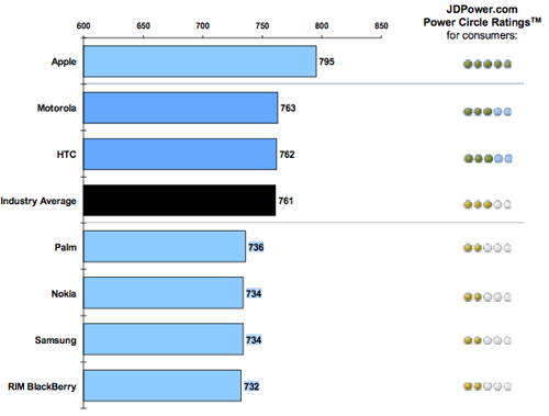 ближайшими конкурентами iPhone стали телефоны Motorola (763 балла) и HTC
