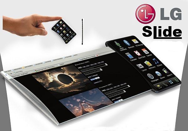 LG Slide: смартфон с гибким дисплеем. Не менее любопытна и идея концепта LG Slide: под его корпусом прячется скручивающийся гибкий дисплей. Что любопытно, автор разработки Джейсон Бетти (Jason Betty)не видит необходимости в сенсорной панели на этом гибком экране, сенсорным является только основной дисплей, который может играть роль тачпада.