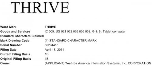 Не мало слухов ходит о планшетном компьютере от компании Toshiba но название его пока не разглашается, но как стало известно на прошлой неделе представители Японской компании обратились в бюро по патентам и товарным знакам Соединенных Штатов для регистрации товарного наименования Thrive, причем из документов видно, что это имя будет использовано для планшетного компьютера. ![]()