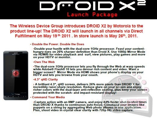 Motorola раскрыла некоторые рекламные буклеты, судя по которым релиз нового смартфона Droid X2 намечен на 26 мая.