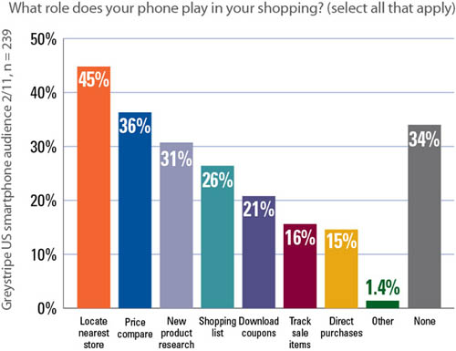 них 45% с помощью телефонов находят ближайшие магазины, 36% - сравнивают