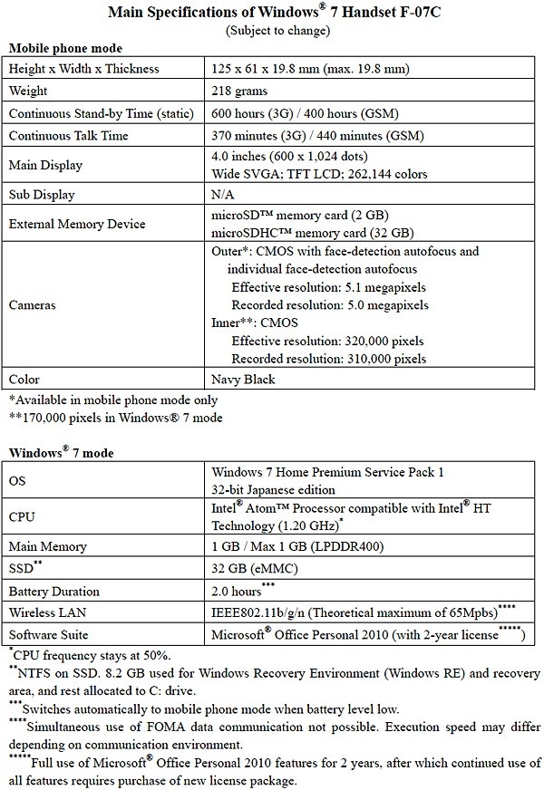 Fujitsu LOOX F-07C – смартфон с двумя операционными системами (Windows 7 и Symbian)Оказалось, что смартфон Fujitsu LOOX F-07C действительно существует, и если верить предварительному перечню технических характеристик, то этот слайдер, весом 218 грамм, способен работать под двумя операционными системами – Symbian и Windows 7 Home Premium. ![]() ![]() В наличии Fujitsu LOOX F-07C также имеется 4.0-дюймовый LCD-дисплей, разрешением 1 024 x 600, процессор Intel Atom на 1.2GHz, 1GB LPDDR400 RAM, WiFi, 32GB встроенной памяти и слот под microSDHC-карту. Также можно найти 5.0-мегапиксельную камеру с автофокусом, и порт HDMI через адаптер USB, однако, если это действительно так, аккумулятор у смартфона практически "никакой". Его ресурса хватает на 600 минут в режиме ожидания и 370 минут в режиме разговора, в то время как под Windows 7, ресурс составляет всего 2 часа, повторимся, что, скорее всего это ошибка.